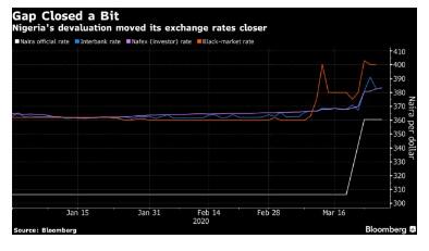 尼日利亚于3月19日下调了奈拉的官方汇率,以跟随外国投资者使用的另一种汇率贬值,因为油价下跌加大了奈拉的汇率压力。但它目前仍维持着一个多汇率体系。一些分析师说,这还远远不够。高盛认为,要使奈拉汇率在今天的油价水平上保持稳定,需要600奈拉的汇率。