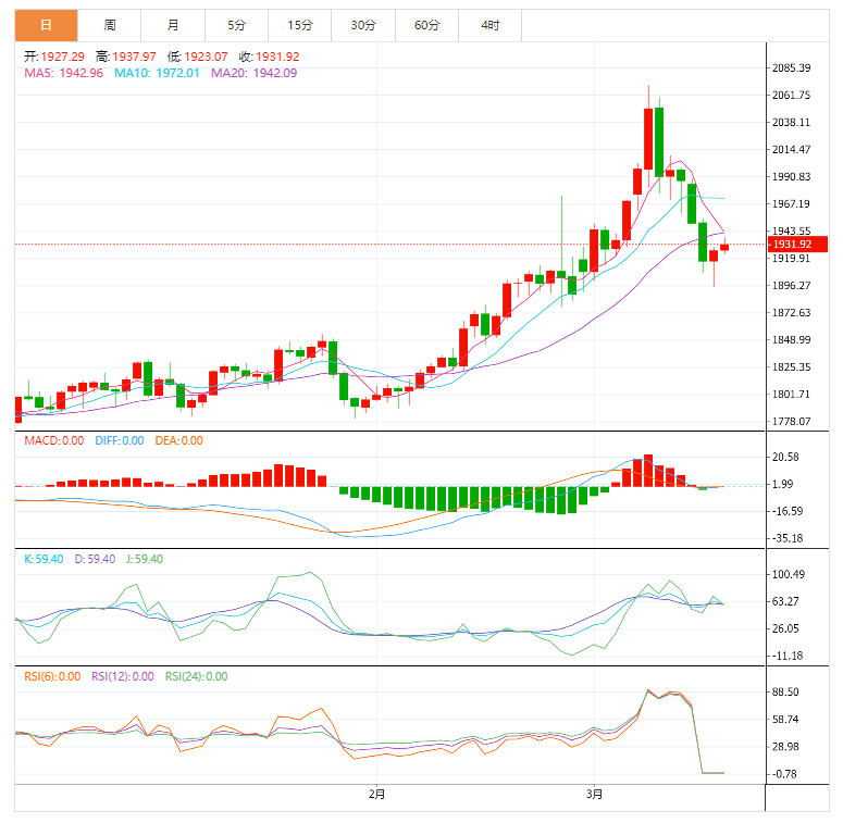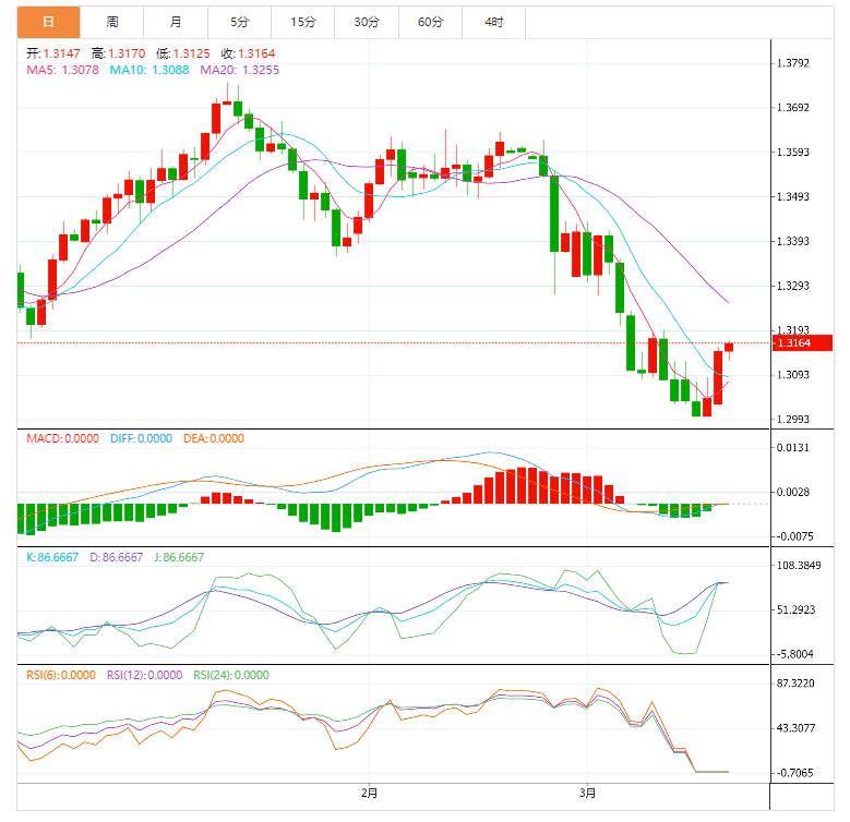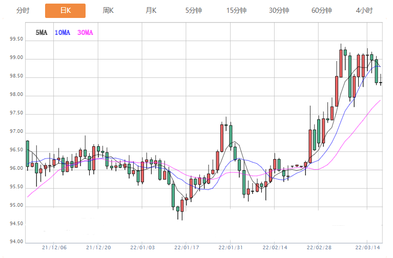 美元指数:截止发稿,美元指数走低,现报98.36附近,跌幅0.01%。欧市盘前,美联储宣布加息25个基点(bps)以抑制飙升的通货膨胀后,美元指数目前跌至98.34。这一决定与预估一致,令美元指数的强劲涨势暂时停顿。美国2月份零售额表现不佳,加剧了人们对美国经济前景的担忧。美国人口普查局(US Census Bureau)报告称,2月份零售额比市场普遍预期的0.4%低0.3%,远低于此前4.9%的数据。