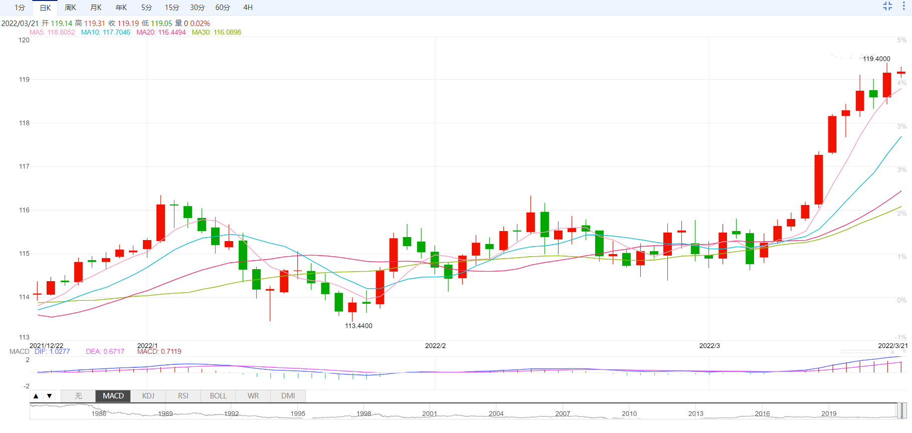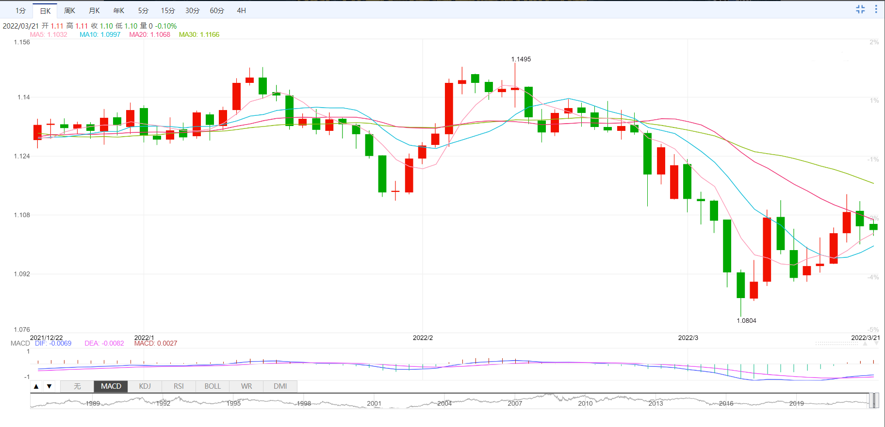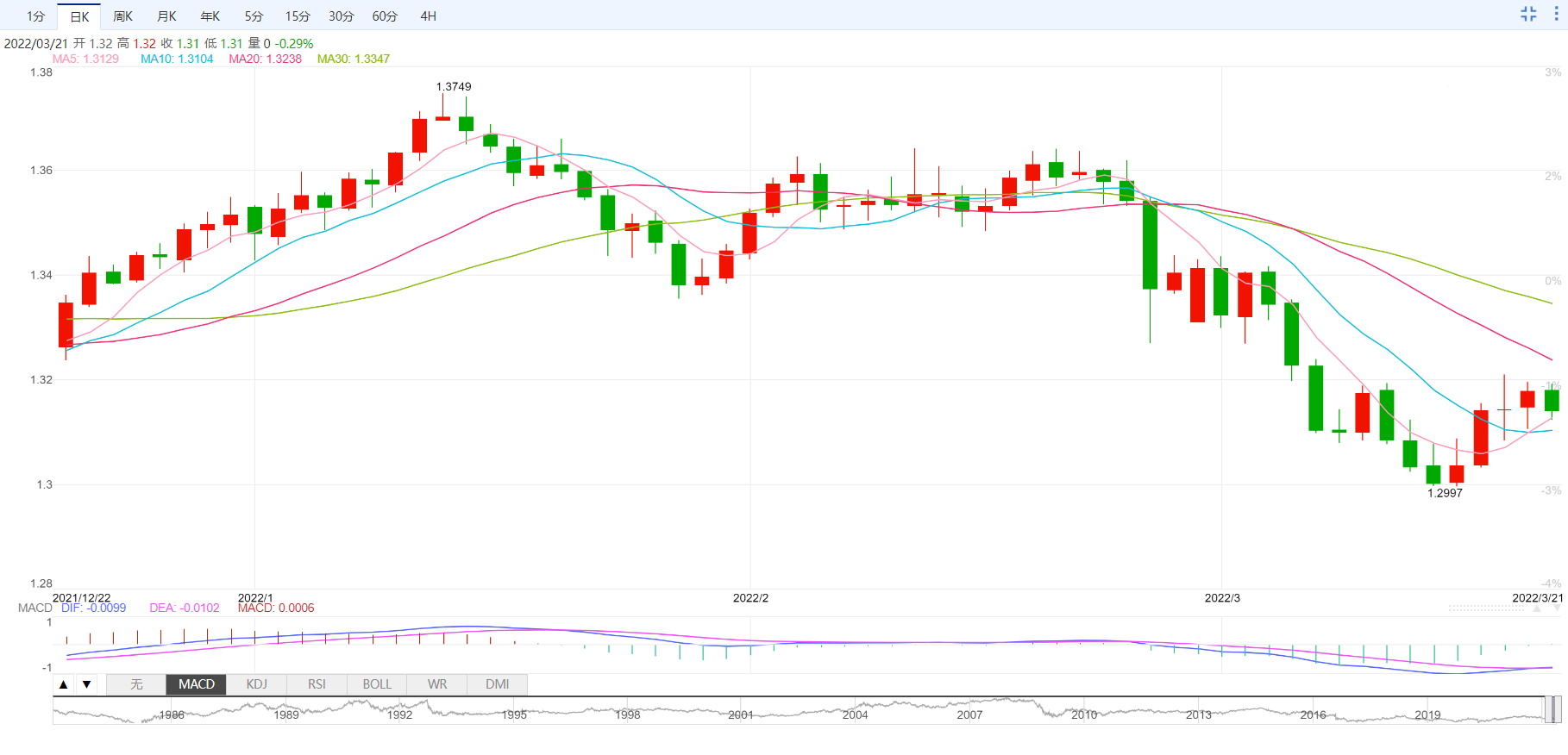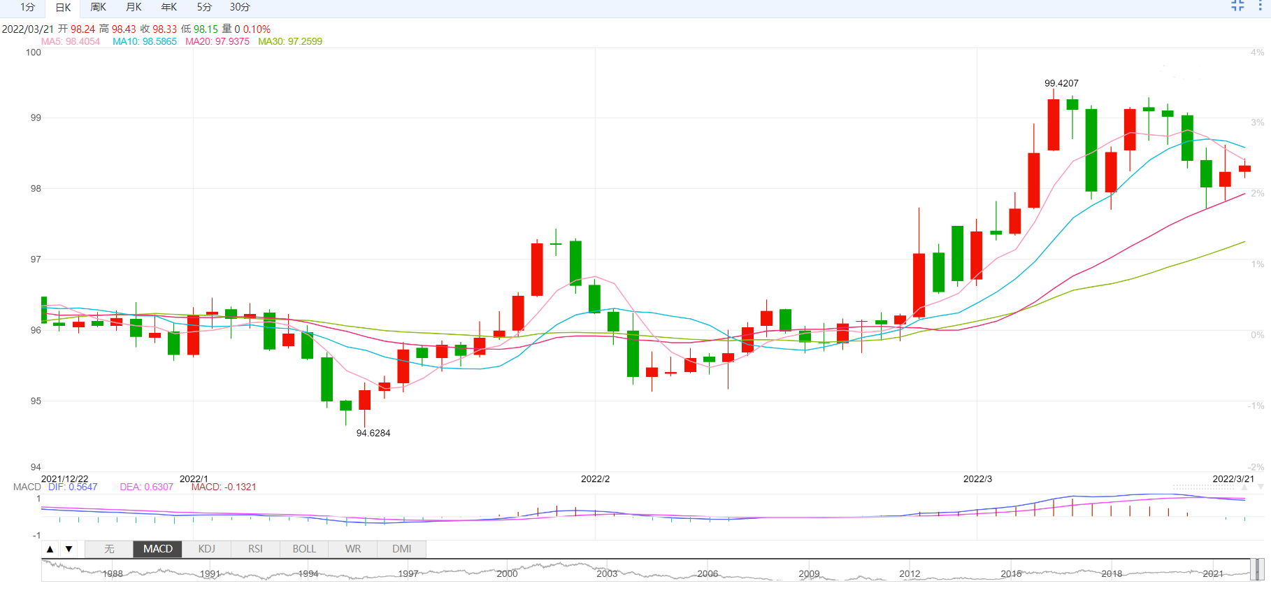 美元指数:截止北京时间20:00,美元指数小幅上涨,现报98.32,涨幅0.10%。纽市盘前,美元在98.20左右没有明确的走势。美联储(Federal Reserve)在3月16日的会议上启动紧缩周期后,该指数成功从最近低于98.00的水平反弹。围绕地缘政治环境的担忧,似乎支撑了对美元的需求,以及风险相关综合体的报价立场。今晚,关注美联储主席鲍威尔的讲话。技术面上,美元指数上升了0.03%,达到98.25,突破99.29(3月14日的高点)将打开通往99.41(2022年3月7日的高点)的大门,最终达到99.97(2020年5月25日的高点)。