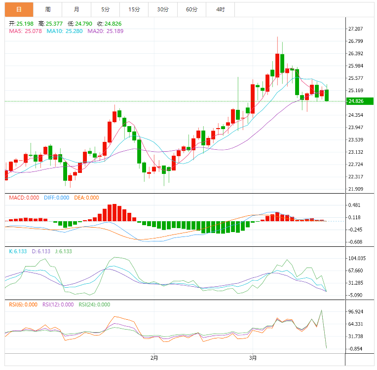 现货白银:截止北京时间20:00,现货白银小幅下跌,现报24.84,跌幅1.32%。纽市盘前,白银处在25.20-30 美元附近。周一,50 日均线向上穿越 200 日均线(即金叉)验证银价上涨信号,但多头似乎测试10日均线25.35 美元。同样对上涨动能构成阻力的是 MACD 信号看跌。即便如此,相对强弱指标更为走强且银价维持处在 2 月3 日以来的上行倾向趋势(最新处在24.80 美元附近),令多头维持期待。若银价跌破上述支撑 24.80 美元附近,则最新构筑的金叉无效,汇价可能会接近月线低位24.30 美元附近。