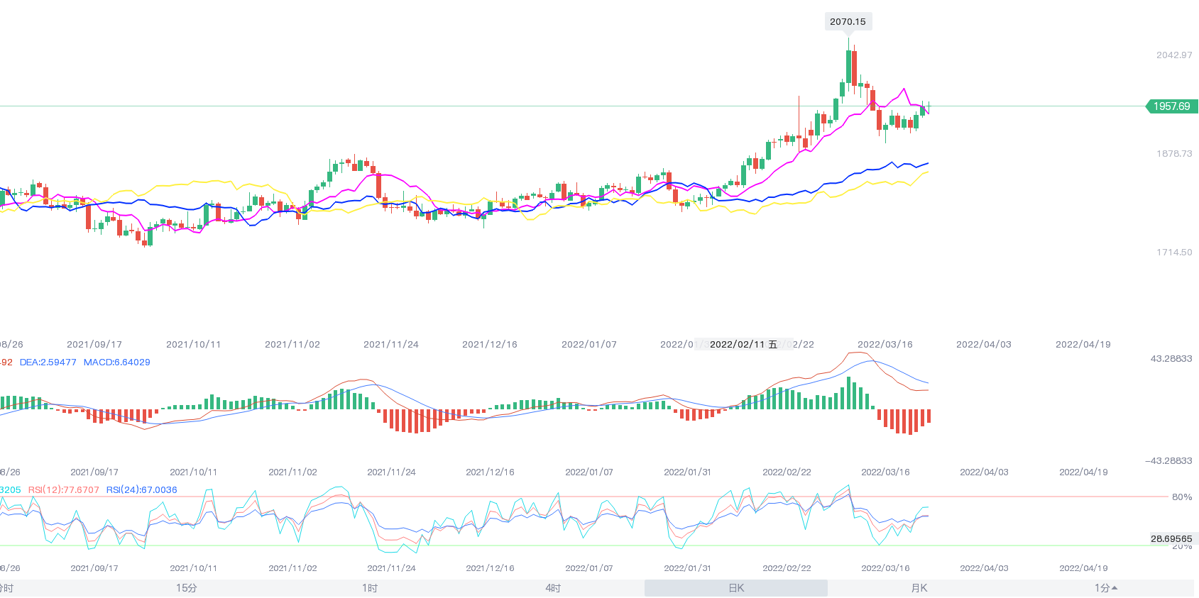 上周五现货黄金在逾20美元的区间内震荡,盘中最低触及1943.14,最终几近收平,报1957.4美元/盎司;现货白银同样横盘震荡,最终收跌0.01%,报25.51美元/盎司。