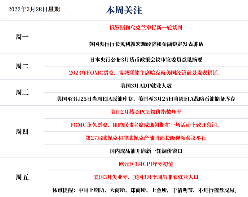 待定,俄罗斯和乌克兰举行新一轮谈判。乌克兰谈判代表称,乌克兰和俄罗斯代表团将于3月28日至30日在土耳其举行会谈。俄方代表团团长此前表示,俄乌双方在俄罗斯坚持的主要立场上没有取得任何进展。