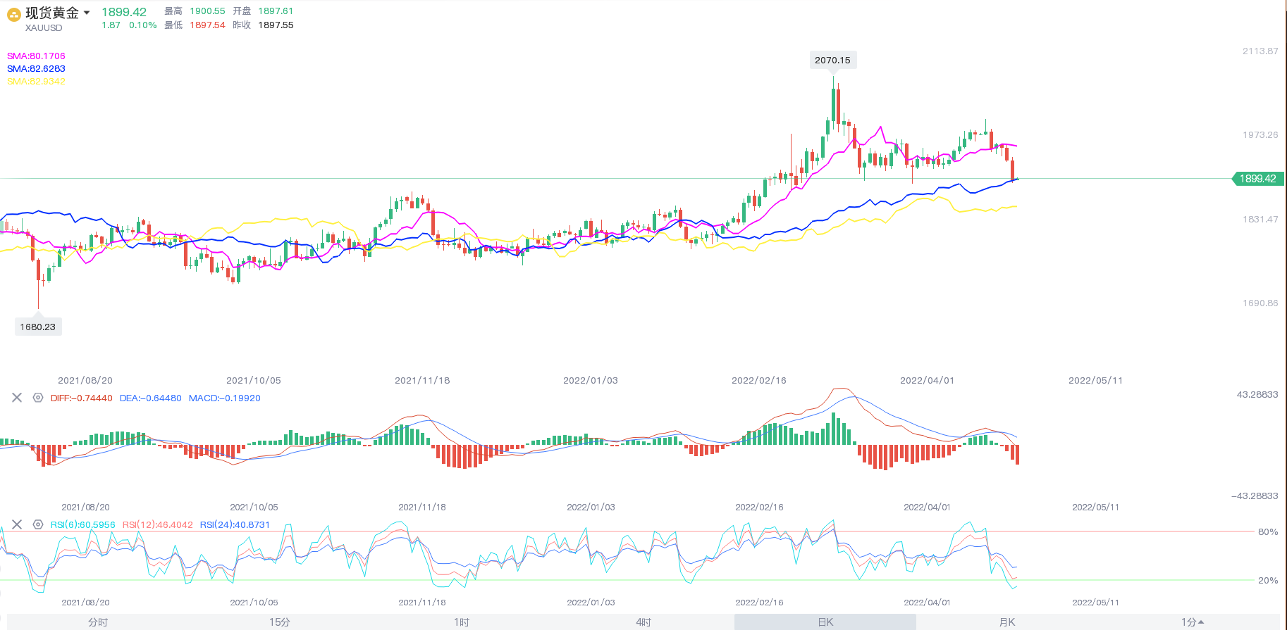 现货黄金暴跌近60美元,自3月29日以来首次跌破跌破1900美元关口,收跌1.8%,报1898.01美元/盎司; 现货白银跌幅一度超3%,尾盘略有回升,收跌2.02%,报23.63美元/盎司。