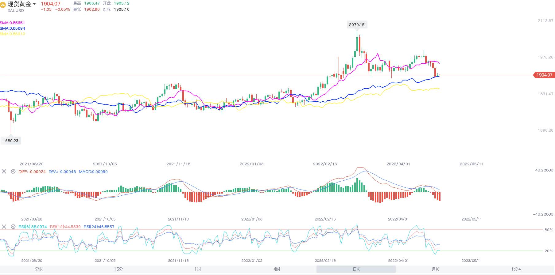 周二,现货黄金在1900美元关口附近震荡,盘中一度突破1910美元/盎司,收涨0.3%,报1905.24美元/盎司;现货白银亚盘上行受阻,随后震荡下行,收跌0.39%,报23.51美元/盎司。