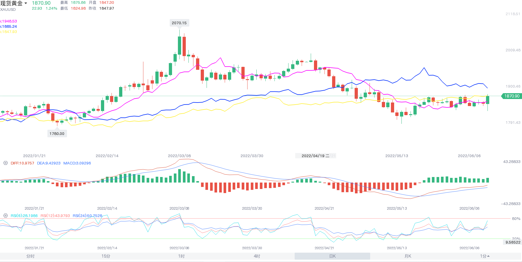 上周五现货黄金止跌反弹, 美盘时段大幅拉升,最高触及1875美元/盎司,收涨1.26%,报1870.96美元/盎司;现货白银一度逼近22美元关口,收涨0.97%,报21.87美元/盎司。