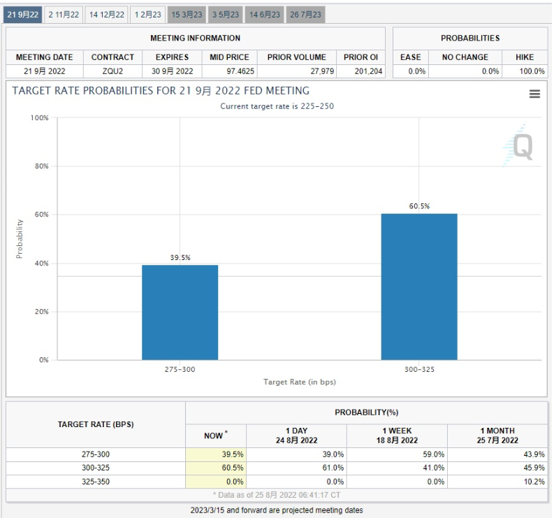 期货市场一直在押注,在9月的会议上更有可能加息四分之三(或百分之0.75)。央行在6月和7月均加息0.75个百分点。联邦基金利率目前在2.25%至2.5%的范围内,美联储的目标是到明年第一季度达到3.50%至3.75%的最终利率或最终利率。