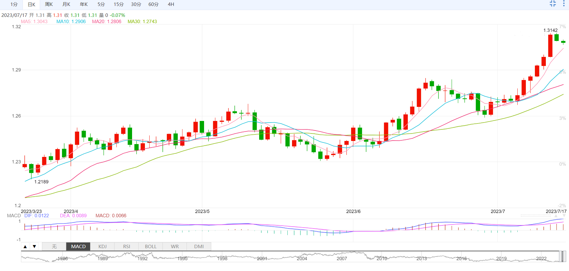 欧元/美元在1.1200的整数关口阻力位上方波动加大。欧元/美元维持盘整,投资者正在等待美国6月零售销售数据提供进一步指引。由于欧元区通胀升温,欧洲央行预计将决定7月以后的加息倾向,欧元因此极为强劲。欧元区整体通胀率为5.5%,不包括石油和食品价格波动的核心通胀率为5.4%,与2%的目标通胀相差甚远。如果日收盘价超过前一日的峰值1.1245,则将突破最新烛台形态所支持的看跌偏见。