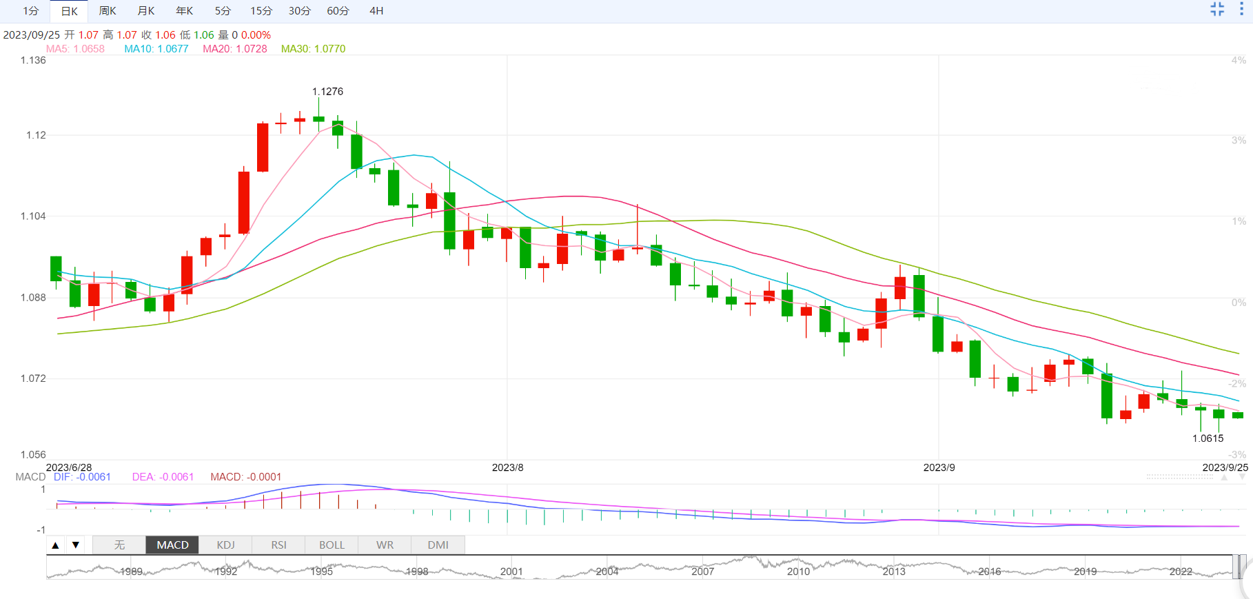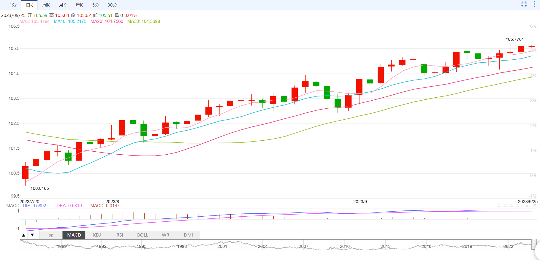 美元指数:截止发稿,美元指数上涨,现报105.61,涨幅0.01%。欧市盘前,美元再次证明了它是名副其实的“王者”,对几乎所有主要G20货币都有所上涨。在美国国债收益率上升的支持下,美元在利差似乎成为决定哪种货币贬值、哪种货币升值的驱动因素的环境中走强。随着美国10年期国债收益率突破2007年10月的高点,达到4.51%,美元王者的头衔似乎得到了肯定。