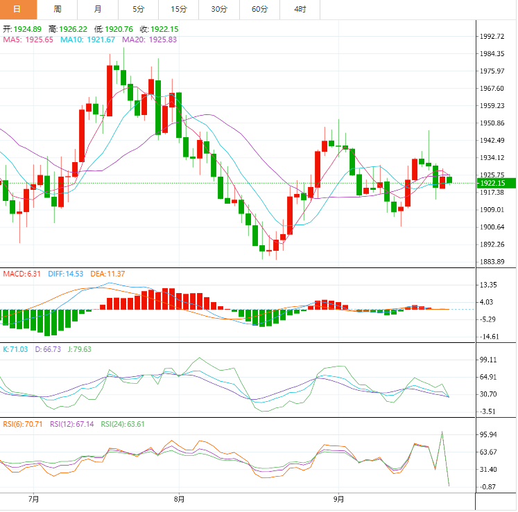 在上周微涨之后,金价周一下滑跌0.2%至1921.94一线,投资者正在等待美联储首选的通胀指标--个人消费支出(PCE)物价指数于9月29日公布,投资者权衡美联储官员称未来仍可能加息的警告。