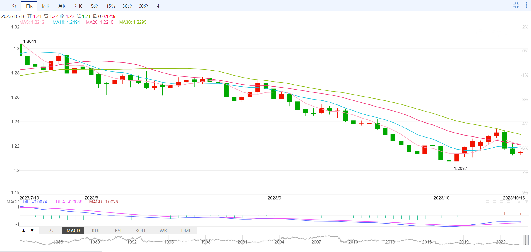 美元指数:截止发稿,美元指数报105.55,跌幅0.13%,最高106.63,最低106.53。美元难以延续过去两个交易日美国消费物价指数(CPI)上涨后带来的涨势,维持区间震荡。市场低估了一种风险,即通胀下降进程停滞或完全停止,核心通胀率再次开始上升,这将在决策者中引发新一轮的恐慌,即他们是否已经采取了足够的行动。如果这种情况发生,美联储将不得不考虑把利率上调至6%或6.5%。