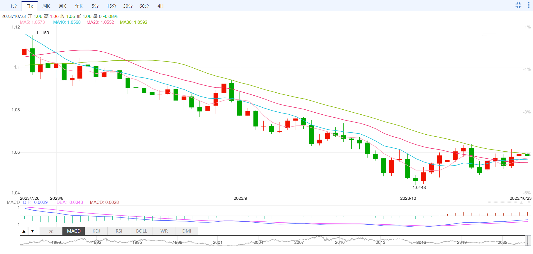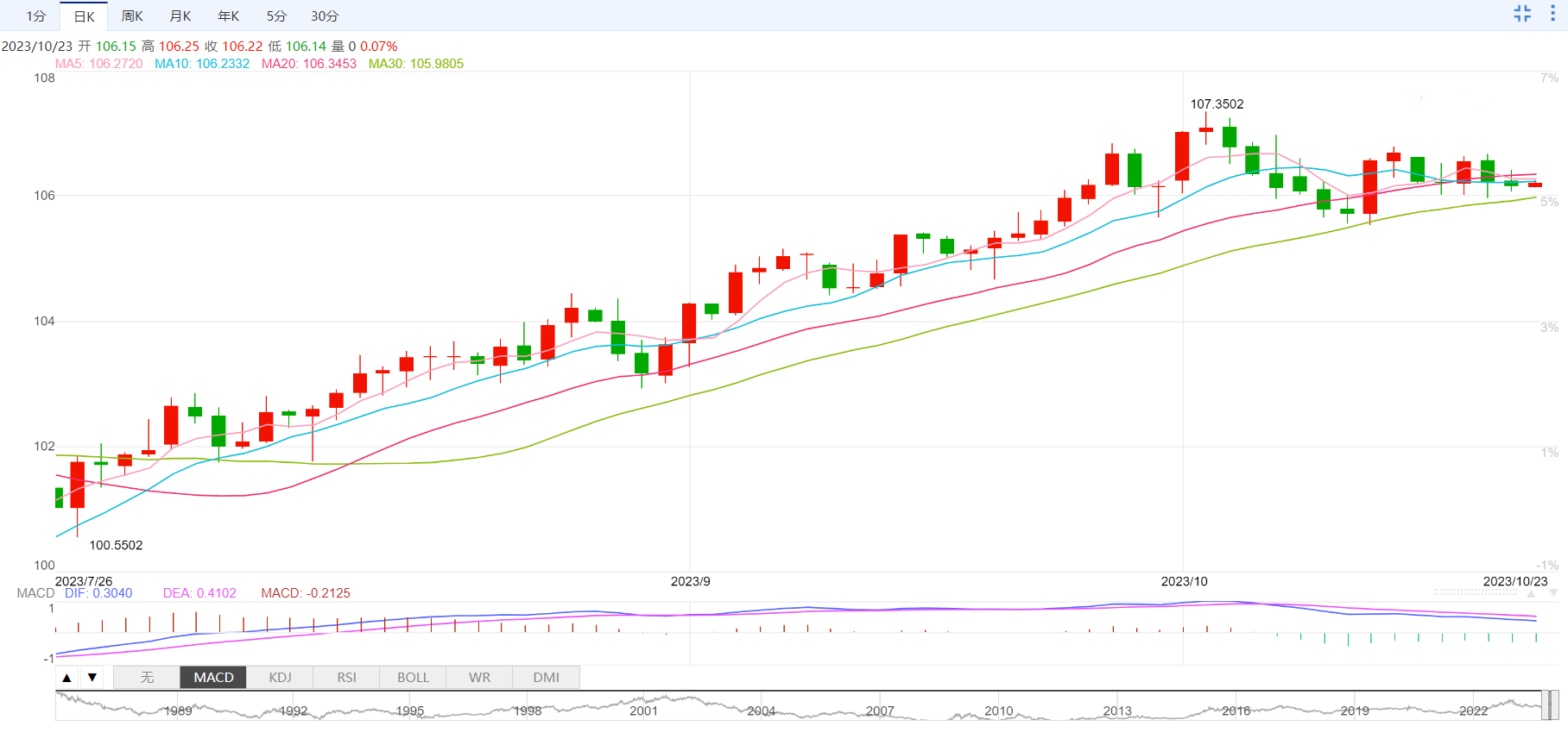 美元指数:截止发稿,美元指数报106.23,涨幅0.08%,最高106.24,最低106.13。美联储隔夜逆回购协议余额的下降速度快于预期,自6月开始以来减少超过1万亿美元。美元指数短线阻力在106.35--106.40,短线重要阻力在106.55--106.60。美联储主席认为,未来的长期走势谁也说不准,美联储所能做的就是关注近期和现在。在鲍威尔发表讲话后,芝商所的美联储观察工具显示,美联储下个月不加息的可能性已是100%。