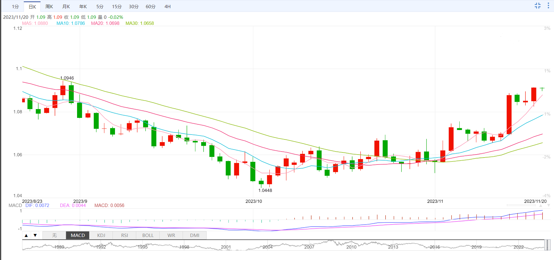 美元指数:截止发稿,美元指数报103.83,涨幅0.01%,最高103.97,最低103.79。美元以积极的基调开启了新的一周,并收复了周五的部分跌幅,跌至两个半月低点,这反过来又被视为欧元兑美元货币对的逆风。然而,任何有意义的美元复苏似乎仍然难以捉摸,因为越来越多的人认为美联储已经完成了加息,美国数据显示通胀降温速度快于预期。