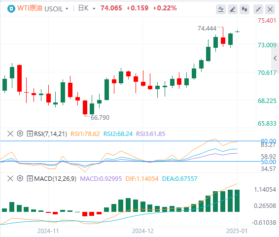 周三亚盘,原油交投74.06附近。受西方制裁导致的俄罗斯和伊朗供应收紧担忧以及对中国需求增长预期的推动,国际油价上涨。与此同时,美国和欧洲的寒冷天气推动了取暖油的需求,但全球经济数据限制了油价的进一步上涨空间。市场参与者正等待本周更多经济数据的发布,其中美国12月非农就业报告将于周五公布,投资者希望从中寻找美联储利率政策和原油需求前景的线索。