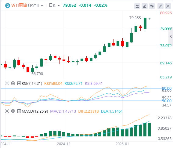 周四亚盘,原油交投79.05附近。国际油价大幅上涨,主要受美国原油库存大幅减少和新一轮美国对俄罗斯制裁可能引发的供应中断推动。然而,加沙地区停火协议的达成限制了油价涨幅。