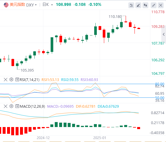 1月16日,北京时间周四亚市早盘,美元指数徘徊在108.99附近。周三,因低于预期的数据缓解了人们对通胀加速的担忧,并增加了美联储今年降息两次的可能性。美元指数小幅走弱,盘中一度跌破109关口,但随后急剧拉升并收复日内大部分失地,最终收跌0.07%,报109.10。美债收益率大幅下跌,基准的10年期美债收益率收报4.657%;对货币政策更敏感的两年期美债收益率收报4.266%。受数据提振,现货黄金延续涨势,一度逼近2700美元大关,但未能站上此处,最终收涨0.73%,报2696.41美元/盎司。现货白银最终收涨2.59%,报30.66美元/盎司。原油在美盘前时段持续上涨,盘中创下自2024年7月以来的新高。WTI原油冲上79美元上方,最终收涨2.84%,报79.11美元/桶;布伦特原油收涨2.36%,报81.59美元/桶。