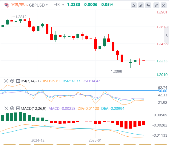 英镑:截止发稿,英镑/美元徘徊于1.2233附近。英镑/美元上周四下跌,收报1.2239,跌幅0.02%。英国数据继续低于目标,英国零售销售数据紧随其后。外汇市场从以美国为中心的经济数据中获得了难得的喘息机会。技术面上,突破 1.2250 水平将推动英镑/美元走向 50 MA 1.2302。如果英镑/美元攀升至 50 MA 上方,它将朝着阻力位 1.2355 – 1.2370 前进。