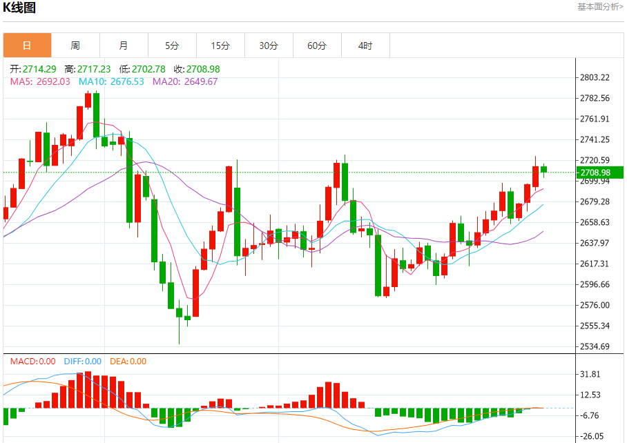 现货黄金:截止北京时间21:26,现货黄金下跌,现报2709.63,跌幅0.21%。纽市盘前,黄金价格显示出一些轻微的看跌倾向,可能测试2700.00美元的障碍,等待获得推动价格恢复主牛市的积极动机,其目标是从超过2730.00美元开始,以确认打开通往2790.00美元的道路。