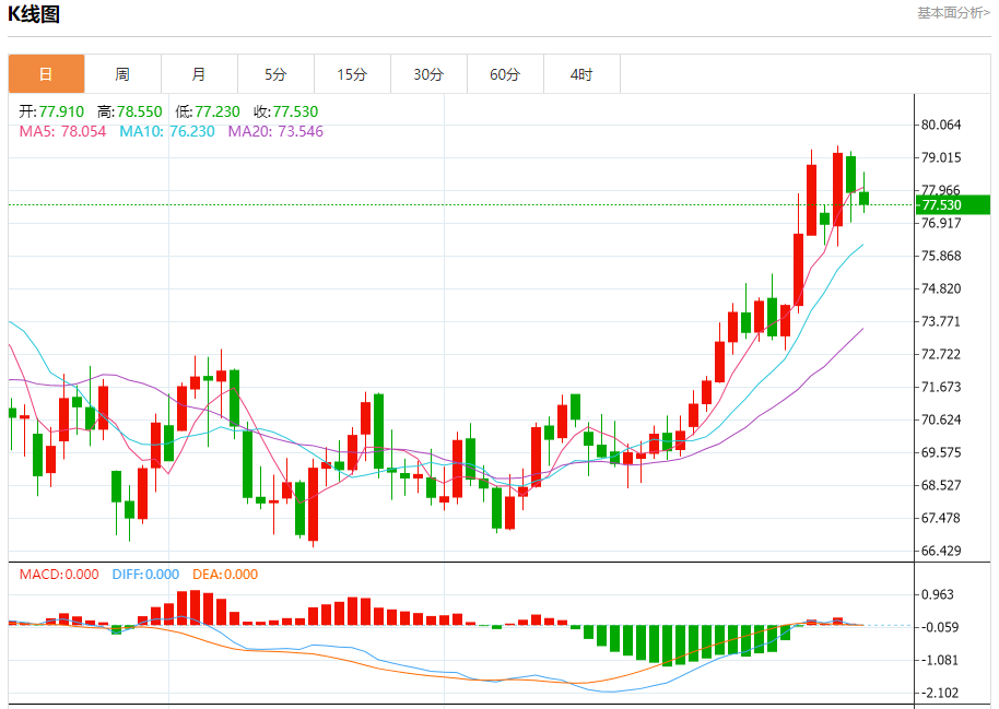 原油市场:截止北京时间21:26,美油下跌,现报77.510,跌幅0.44%。纽市盘前,原油价格向上攀升,试图在图表中出现的看涨通道内恢复看涨趋势,以保持看涨趋势在今天有效和活跃,提醒您我们等待的目标从80.70美元开始,并在超过前一水平后延伸至83.00美元,而实现这些目标需要持有78.25美元以上。