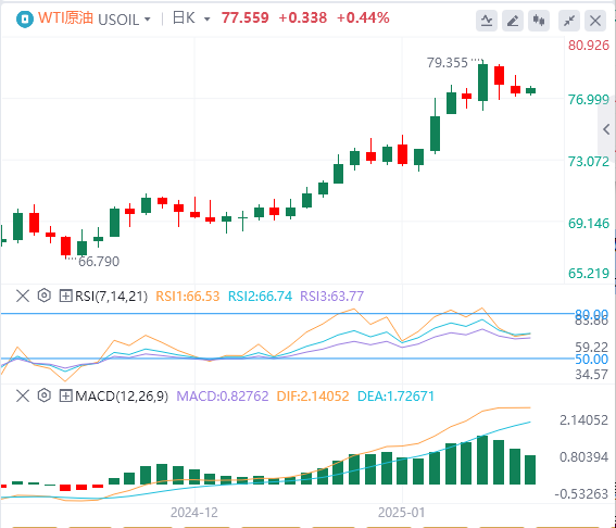 周一亚盘,原油交投77.55附近。在供应收紧和强劲的季节性需求的推动下,原油价格上周收盘强劲上涨。美国对俄罗斯石油生产商和油轮的制裁严重扰乱了全球航运路线,减少了可用供应并提振了市场情绪。与此同时,美国和欧洲的天气比预期更冷,增加了对取暖油的需求,增加了看涨的基调。
