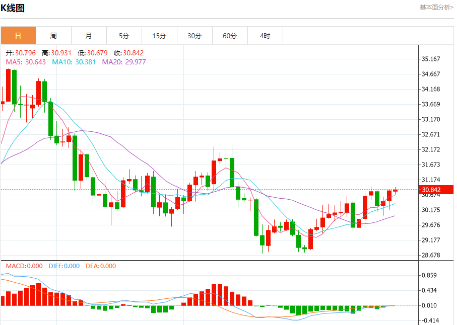 现货白银:截止北京时间21:20,现货白银上涨,现报30.842,涨幅0.09%。纽市盘前,白银价格稳定在30.63美元上方,显示自上午以来交易疲软,因此,看涨趋势情景将在今天保持有效,没有任何变化,这为价格稳定在上述水平上方创造了条件,提醒您我们的主要等待目标达到31.63美元。