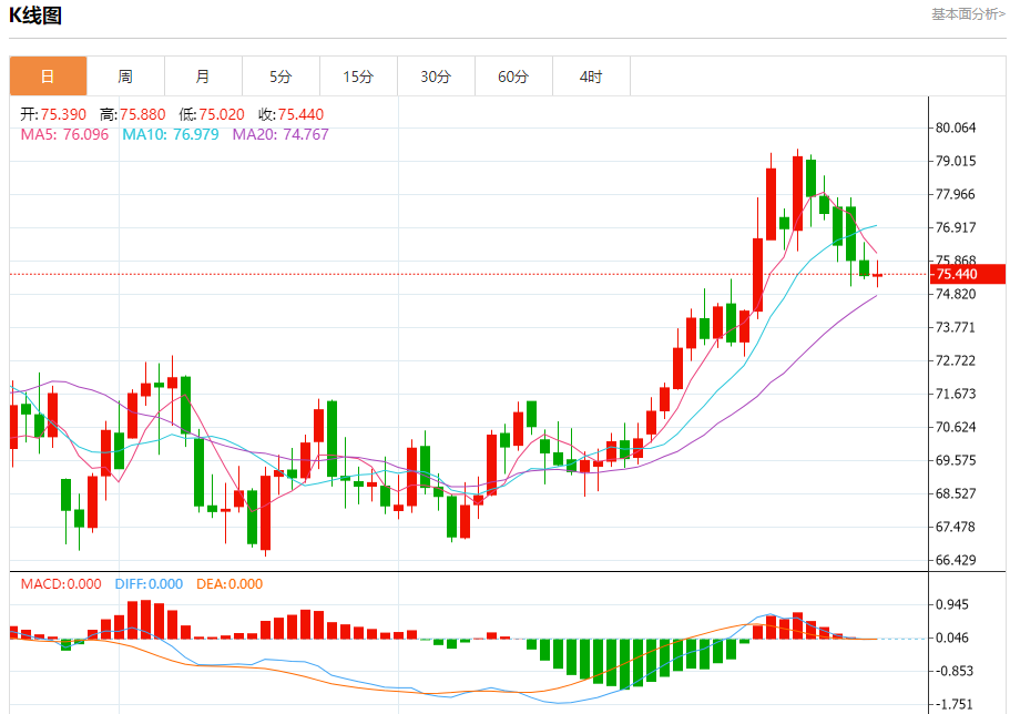 原油市场:截止北京时间21:20,美油下跌,现报75.420,跌幅0.00%。纽市盘前,原油价格现在显示出积极的交易,它可能会再次测试77.53美元,然后转向下跌。