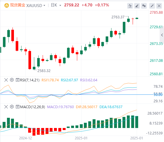 周五亚盘,黄金交投于2759.22附近。来自美国(US)的经济数据显示,劳动力市场正在降温,而市场参与者继续消化美国总统特朗普的贸易政策言论。美国劳工部的数据显示,在截至1月18日的一周内,有更多的美国人申请失业救济金,这通常表明劳动力市场疲软。尽管如此,该报告显示,天气扭曲和洛杉矶的火灾是造成这种情况的主要原因,并且可能会反映在后续版本中。