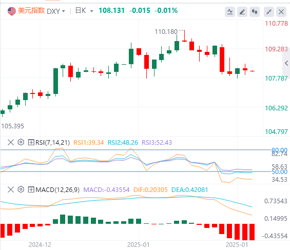 1月24日,北京时间周五亚市早盘,美元指数徘徊在108.13附近。周四,因美国总统特朗普发表了呼吁降低利率的言论,但未就关税问题作出明确表态,美元指数亚欧盘呈区间震荡,但在美盘急速下跌,盘中一度失守108关口,随后收复部分失地,最终收跌0.1%,报108.14。美债收益率涨跌不一,基准的10年期美债收益率小幅上行,收报4.646%;对货币政策更敏感的两年期美债收益率回落至4.300%。现货黄金呈过山车走势,其在美盘前一度跌至2735.96美元的日内低点,随后又强势收复大部分失地,最终收跌0.05%,报2754.52美元/盎司。现货白银最终收跌1.24%,报30.42美元/盎司。因特朗普呼吁沙特和欧佩克降低油价,两油应声回落。WTI原油在美盘时段急速跳水,日内跌幅超1%,最终收跌1.48%,报74.12美元/桶;布伦特原油收跌1.21%,报77.28美元/桶。