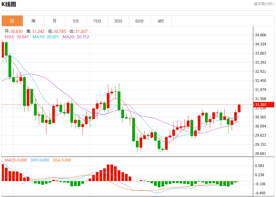 现货白银:截止北京时间21:26,现货白银上涨,现报31.214,涨幅1.29%。纽市盘前,白银价格显示出新的看涨倾向,以加强对未来几个交易日继续看涨趋势的预期,其下一个主要目标位于31.63美元,位于图表上出现的看涨通道内。