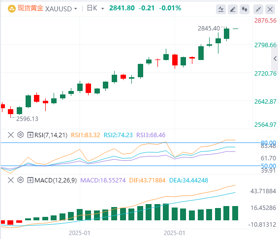 周三亚盘,黄金交投于2841.8附近。金价周二再创历史新高至2845.30美元,为连续四个交易日刷新历史高点,收报2841.85美元,受投资者寻求避险资产推动,此前中国针对美国总统特朗普的关税措施采取了报复性关税措施。另外,美国12月职位空缺创14个月来最大降幅,也拖累美元和美债收益率下跌,给金价提供上涨动能。投资者的焦点现在转向周三的ADP就业报告、周五的就业报告以及多位美联储官员的讲话。