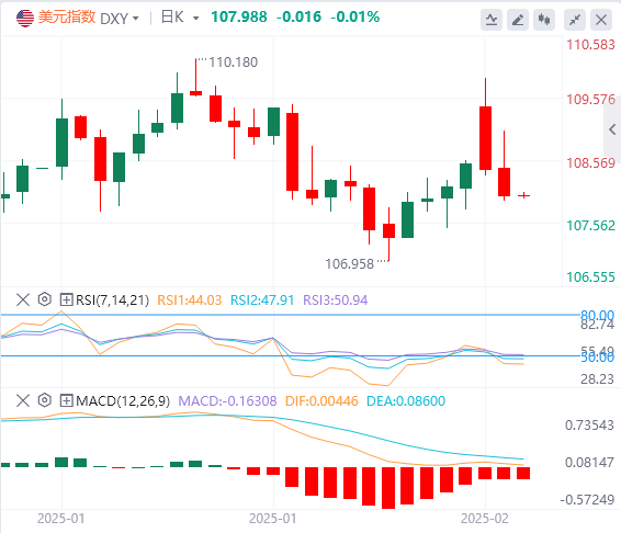 美元指数:截止发稿,美元指数徘徊在107.98附近。特朗普总统已同意暂停对加拿大和墨西哥进口产品征收25%关税长达30天。此前,加拿大总理特鲁多和墨西哥总统克劳迪娅·辛鲍姆承诺加强边境安全措施,以解决非法移民和贩毒问题。12月份JOLTS职位空缺数量下降至760万个,低于市场普遍预期的800万个。技术面上,如果美元指数保持在108.30的支撑位下方,它将走向位于106.80–107.00区间的下一个支撑位。