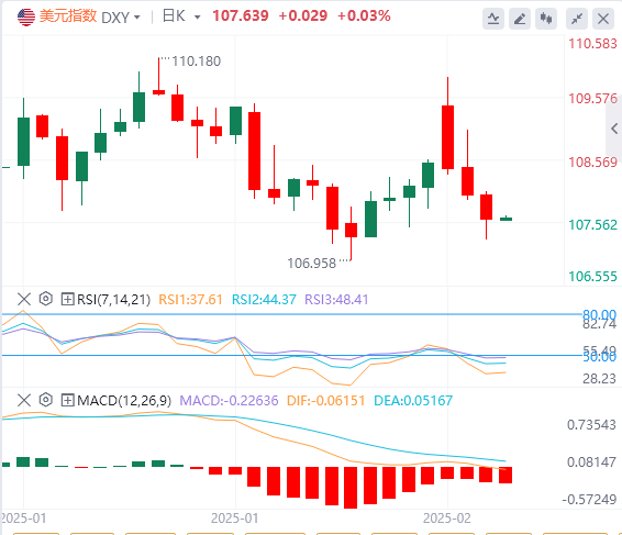 2月6日,北京时间周四亚市早盘,美元指数徘徊在107.63附近。周三,美国数据好坏不一,美联储官员言论谨慎,美元指数继续下跌,收跌0.36%,报107.62。美国2年期国债收益率跌至去年12月12日以来的最低水平,收报4.19%。基准的10年期美债收益率跌至去年12月中旬以来的最低点,收报4.42%。美国2年期与10年期国债收益率利差为12月23日以来的最窄水平。受美元和美债收益率下跌以及贸易担忧带来的避险需求推动,国际金价续创新高,现货黄金盘中突破2880美元/盎司,收涨0.88%,报2867.12美元/盎司;现货白银收涨0.64%,报32.30美元/盎司。因市场担忧国际贸易紧张或抑制石油需求,且美国上周EIA原油库存增超860万桶,国际油价明显走低,WTI原油收跌2.11%,报70.91美元/桶;布伦特原油收跌1.93%,报75.23美元/桶。