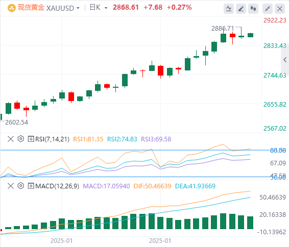 周一亚盘,黄金交投于2868.61附近。周一亚市早盘,黄金将涨势扩大至2865美元左右。随着贸易紧张局势升级促使投资者在避险资产中寻求避险,贵金属小幅走高。美国总统唐纳德·特朗普周五表示,他计划在周一或周二之前宣布对许多国家征收互惠关税,这几乎会立即生效。这反过来又为黄金提供了一些支撑。投资者将密切关注贸易战威胁的事态发展。“黄金市场的核心焦点仍然是特朗普关税政策的不确定性,”HighRidgeFutures金属交易主管DavidMeger表示。