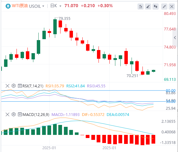 技术面:WTI原油交易价格高于每桶70.50美元,测试71.00美元的关键阻力位。若成功突破这一门槛,可能为进一步上涨铺平道路,而即时支撑位在70.00美元。交易者将密切关注即将发布的宏观经济发展以获取更多市场方向。