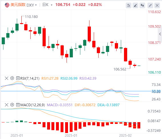 美元指数:截止发稿,美元指数徘徊在106.75附近。美元在上周低点附近徘徊,没有明显的方向动力。由于美国1月份零售销售数据疲软,联邦基金期货目前预计2025年将降息50个基点。尽管零售额未达预期,但消费支出仍然受到实际工资增长、稳固的劳动力市场和强劲的家庭资产负债表的支撑。技术面上,美元指数继续尝试收于支撑位106.80–107.00下方。如果美元指数成功收于106.80水平下方,它将向位于105.50–105.70区间的下一个支撑位移动。