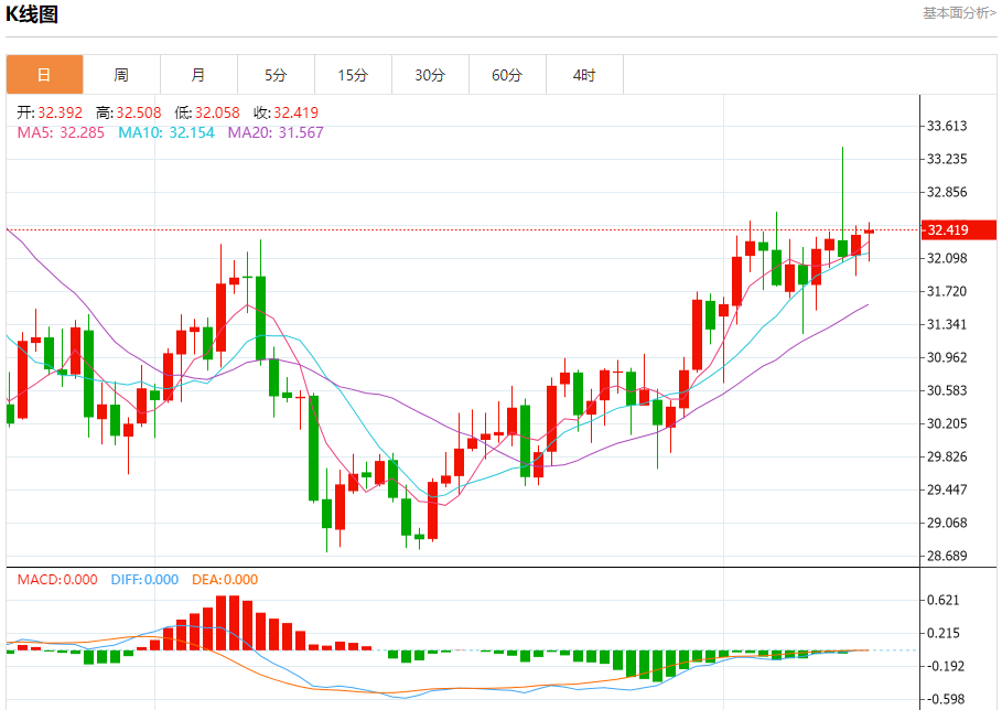 现货白银:截止北京时间21:18,现货白银上涨,现报32.416,涨幅0.19%。纽市盘前,白银价格从昨天开始在横盘轨道内波动,注意到EMA50继续从下方支撑价格,等待收集积极的动力,帮助推动价格恢复未来一段时间的预期看涨趋势,其目标从测试32.86美元开始。