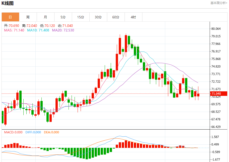 原油市场:截止北京时间21:18,美油上涨,现报71.04,涨幅0.49%。纽市盘前,原油价格在前几个交易日提供了积极的交易,以超过图表上出现的熊市通道的阻力线,显示今天开盘时交易疲软,等待获得负面动机,以帮助推动价格恢复日内和短期的预期熊市偏向。