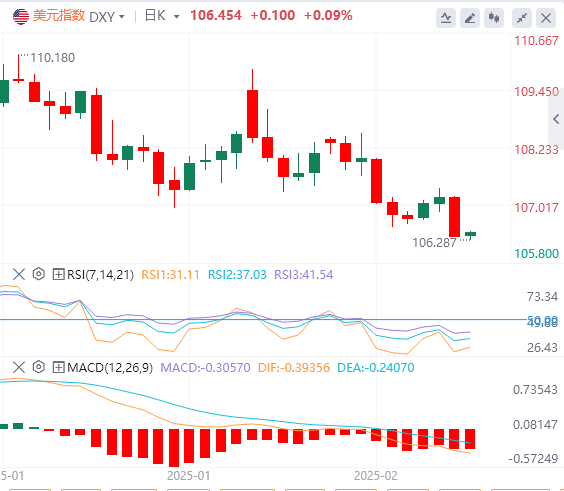 2月21日,北京时间周五亚市早盘,美元指数徘徊在106.45附近。周四,美元指数因“关税疲劳”,全日单边下行,最终失守107美元关口,收跌0.73%,报106.38。基准的10年期美债收益率收报4.5110%;对货币政策更敏感的两年期美债收益率收报4.2850%。美元兑日元跌破150关口,为去年12月9日以来首次,收跌1.21%。俄罗斯卢布兑美元上涨,自去年夏天以来首次升破90。因特朗普表示木材关税可能于4月2日左右宣布,再度提振了避险情绪,现货黄金触及2954.93美元,创下今年第十个新高,但在美国财长贝森特表示没有重新评估黄金储备价值的想法后,黄金开始回落,最终收涨0.21%,报2939美元/盎司。现货白银最终收涨0.80%,报32.95美元/盎司。因数据显示美国汽油和馏分油库存减少,同时对俄罗斯供应中断的担忧也支撑了油价,国际油价连续第三日上涨。WTI原油最终收涨0.64%,报72.53美元/桶;布伦特原油收涨0.70%,报76.57美元/桶。