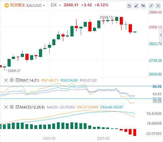 周五亚盘,黄金交投于2880.41附近。尽管随着投资者获利回吐,黄金价格已跌至2900美元/盎司以下,但一位市场分析师表示,贵金属仍受到良好支撑。不断上升的通胀压力和围绕潜在全球贸易战的混乱增加了因政府和央行政策失误影响全球经济活动的风险。