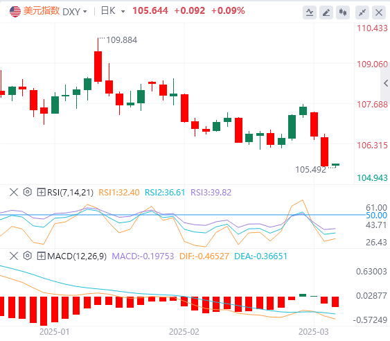 3月5日,北京时间周三亚市早盘,美元指数徘徊在105.64附近。周二,美元指数持续下行,并跌至105关口附近,最终收跌0.93%,报105.56。美债收益率大幅反弹,基准的10年期美债收益率收报4.248%;对货币政策更敏感的两年期美债收益率收报4.005%。因德国保守派和社会民主党同意设立5000亿欧元基础设施基金,并将改革借贷规则以增加国防支出,欧元兑美元日内大涨1%,创三个月来的新高。在美国总统特朗普征收新关税后贸易冲突升级的背景下,现货黄金持续反弹,并重一度冲上2920美元,最终收涨0.83%,报2917.64美元/盎司。现货白银收涨0.92%,报31.96美元/盎司。因欧佩克+确认4月增产,且特朗普的关税政策会对原油需求产生影响,两油延续下跌趋势。WTI原油日内持续下挫,并一度跌至66.53美元的日内低点,最终收跌0.67%,报67.78美元/桶;布伦特原油收跌0.54%,报71美元/桶。