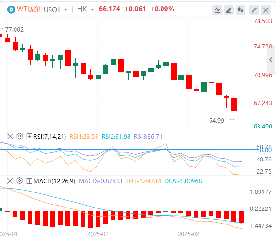 周四亚盘,原油交投66.17附近。国际油价连续第四个交易日下跌,美国原油库存增幅超预期,进一步加剧市场压力。与此同时,投资者对OPEC计划自4月起增产,以及美国对加拿大、中国和墨西哥加征关税的担忧情绪持续升温。