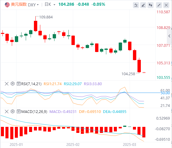 3月6日,北京时间周四亚市早盘,美元指数徘徊在104.28附近。周三,由于担心关税对通胀和经济的影响,投资者现在开始对美国经济出现全面萎缩的可能性进行定价,以及特朗普将推迟部分汽车关税,美元指数录得三连阴,并失守105关口,创近四个月以来的新低,最终收跌1.15%,报104.33。欧元兑美元触及创近四个月以来的新高,有望创下自2022年11月以来表现最佳的一周。美债收益率持续上行,基准的10年期美债收益率收报4.281%;对货币政策更敏感的两年期美债收益率收报4.013%。尽管美元走弱,但投资者似乎仍不愿在非农数据公布前进行大规模押注,现货黄金坐上过山车,其盘中一度跌破2900美元,随后迅速收复全部失地并冲向2930美元,而后又有所回落,最终收涨0.05%,报2919.12美元/盎司。现货白银日内持续上行,最终收涨2.11%,报32.64美元/盎司。特朗普的贸易战给原油需求前景蒙上阴影,在欧佩克+发出信号增加供应之际,国际油价连续四个交易日收阴,暴跌至三年多来的最低点。WTI原油日内大跌近4%,并一度跌至65美元附近,最终收跌2.46%,报66.11美元/桶;布伦特原油失守70美元大关,最终收跌2.45%,报69.26美元/桶。