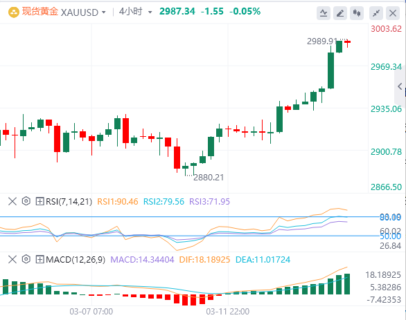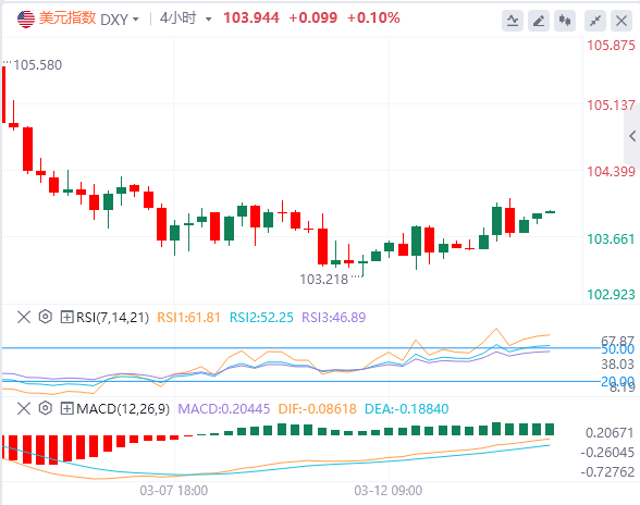 3月14日,北京时间周五亚市早盘,美元指数徘徊在103.94附近。周四,在特朗普最新威胁加征欧洲进口商品关税后,美元指数冲高回落至104关口上方,随后迅速回吐涨幅,最终收涨0.251%,报103.84。美债在避险情绪的支撑下走高,美债收益率集体下跌,基准的10年期美债收益率收报4.273%;对货币政策更敏感的两年期美债收益率收报3.98%。随着全球贸易战加剧刺激避险需求,现货黄金再刷历史新高,逼近2990美元关口,最终收涨1.9%,报2988.89美元/盎司。现货白银收涨2.15%,报33.86美元/盎司。由于市场权衡包括贸易紧张局势升级的宏观经济担忧以及俄乌停火谈判的进展,国际油价走低。WTI原油收跌1.38%,报66.47美元/桶;布伦特原油收跌1.29%,报69.81美元/桶。
