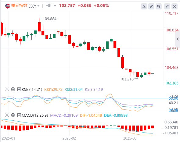 美元指数:截止发稿,美元指数徘徊在103.75附近。由于交易员对弱于预期的密歇根消费者信心报告做出反应,美元指数下跌。报告显示,消费者信心指数从2月份的64.7下降到3月份的57.9,而分析师预测为63.1。技术面上,跌破支撑位103.20–103.40将为测试下一个支撑位102.00–102.20开辟道路。