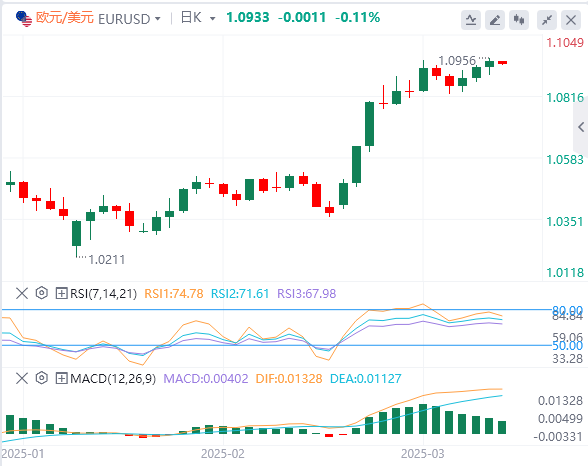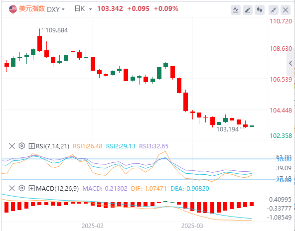美元指数:截止发稿,美元指数徘徊在103.19附近。美国数据方面,2月份建筑许可数量略超出预期,但较1月份水平有所下降。房屋开工数激增,反映出尽管存在广泛的经济不确定性,但房地产市场仍然保持强劲。出口和进口价格上涨幅度超过预期,加剧了通胀担忧。工业生产强劲增长,表明美国制造业具有韧性。技术面上,如果美元指数收于103.20–103.40的支撑位下方,它将走向位于102.00–102.20区间的下一个支撑位。