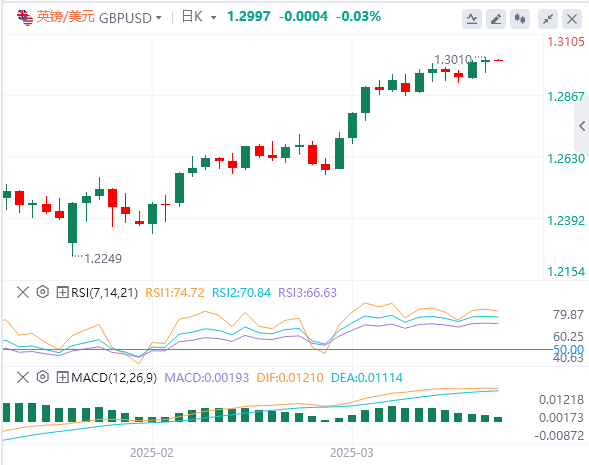 英镑:截止发稿,英镑/美元徘徊于1.2997附近。英镑/美元周三交投清淡,但仍小幅回落至1.3000关口,在美联储(Fed)和英格兰银行(BoE)发出高影响力利率呼吁之前创下19周新高。市场普遍预计美联储本周将保持利率稳定,但联邦公开市场委员会(FOMC)利率预期的新更新将吸引大量关注。技术面上,如果英镑/美元收于1.3000水平上方,它将走向阻力位1.3050–1.3070。