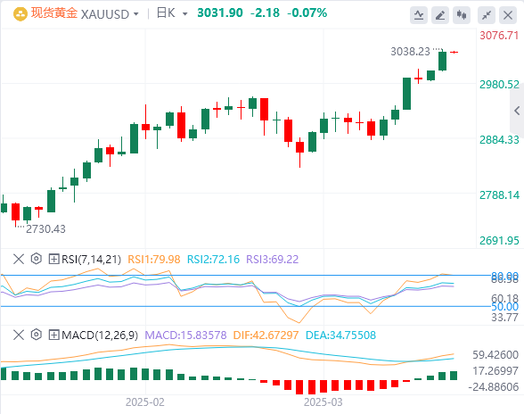 周三亚盘,黄金交投3031.9附近。由于美国总统唐纳德·特朗普将于4月2日颁布的对等关税存在不确定性,金价飙升至3000美元以上,周二创下3038美元的历史新高,而交易员关注美联储(Fed)的货币政策决定。据路透社报道,尽管特朗普与俄罗斯总统弗拉基米尔·普京(VladimirPutin)之间的会谈缓解了交易员的一些压力,后者同意停止攻击乌克兰能源设施30天,但风险偏好仍然恶化。尽管如此,金价继续上涨,年初至今贵金属上涨超过15%。