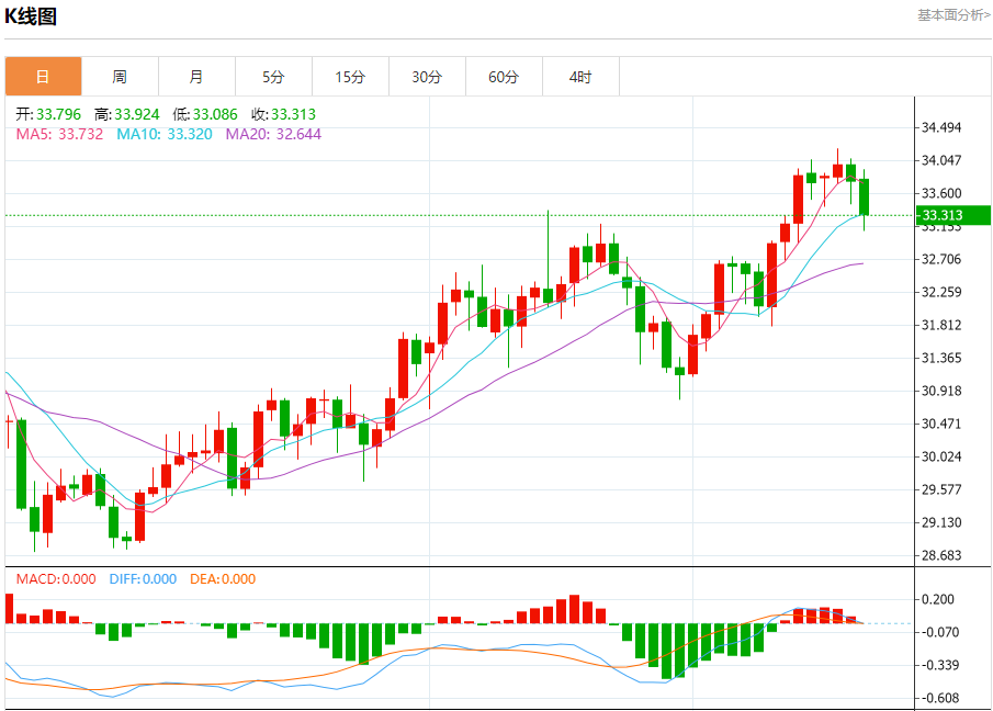 现货白银:截止北京时间20:20,现货白银下跌,现报33.307,跌幅1.37%。纽市盘前,白银价格在后市有望继续维持高位震荡上行的态势。宏观经济层面,美联储政策的不确定性以及全球经济增长前景的不明朗,将持续为白银价格提供支撑。地缘政治局势的紧张短期内难以缓解,避险需求将继续推动白银价格上涨。