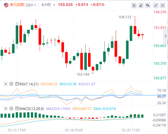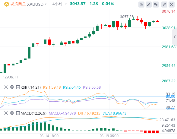 3月21日,北京时间周五亚市早盘,美元指数徘徊在103.82附近。周四,美元指数美盘初站上104关口,创近两周新高,最终收涨0.331%,报103.81。美债收益率多数收跌,收益率曲线持续陡峭化,基准的10年期美债收益率收报4.235%;对货币政策更敏感的两年期美债收益率收报3.974%。现货黄金在盘中早些时候创下3057.25美元/盎司的历史新高后回落,最终收跌0.09%%,报3044.73美元/盎司。现货白银连续第二日下跌,最终收跌0.64%,报33.57美元/盎司。由于美国发布对伊朗的新制裁,国际油价走高。WTI原油美盘期间持续拉升,回升至68关口上方,最终收涨1.94%,报68.32美元/桶;布伦特原油收涨1.81%,报71.84美元/桶。