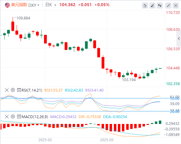 3月25日,北京时间周二亚市早盘,美元指数徘徊在104.36附近。周一,因数据显示美国3月企业活动有所回升,美元指数重回104关口,最终收涨0.16%,报104.31。基准的10年期美债收益率收报4.3460%;对货币政策更敏感的两年期美债收益率收报4.0430%。受美元走强影响,现货黄金在触及3033后持续回调,最终收跌0.39%,报3011美元/盎司。现货白银最终收跌0.01%,报33.12美元/盎司。因特朗普表示将对从委内瑞拉购买石油和天然气的国家征收25%的关税,国际油价继续走高。WTI原油最终收涨1.25%,报69.10美元/桶;布伦特原油收涨1.22%,报73.01美元/桶。