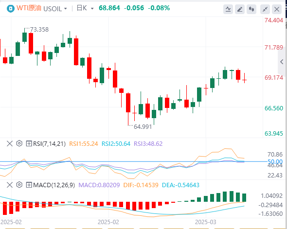 周一亚盘,原油交投69.86附近。受美国能源库存下降以及对全球供应收紧的担忧情绪提振,国际油价上涨。此前,美国总统唐纳德·特朗普(DonaldTrump)威胁对购买委内瑞拉原油的国家加征关税,引发市场对地缘政治风险升级的担忧。根据美国能源信息署(EIA)周三发布的数据显示,截至3月21日当周,美国原油库存减少330万桶,降至4.336亿桶,远超路透社调查中分析师预计的96.5万桶降幅。